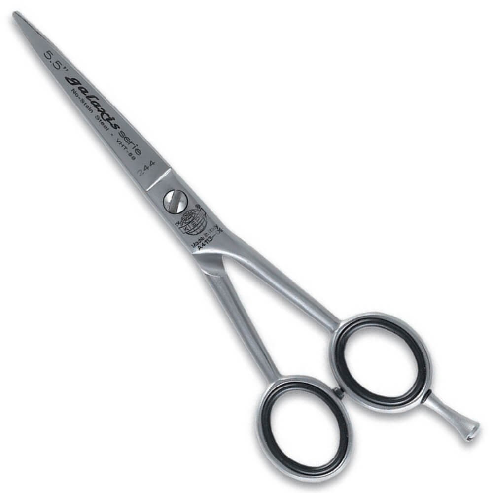 A Kiepe Galaxis olló szénnel dúsított rozsdamentes acélból készült modell. A pengéket a Diamond Sharp rendszerrel edzték és élezték. Az egyenes, lekerekített karokon szabályosan elhelyezett fogantyúk univerzális eszközzé teszik őket. Az ollónak ujjtámasza van, így kényelmesen használható.