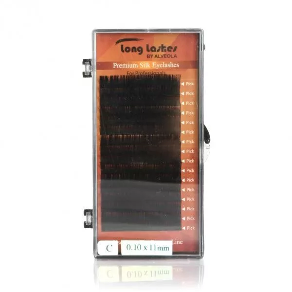 C íveltségű, 0.10mm vastagságú, 11mm hosszúságú selyem szempilla 16 sorban. Prémium minőségű szempillák, melyek véghatása selyemfényű. Könnyített súlya miatt Duplázó technikához ajánlott. Egy tálcán belül egy méretezés.