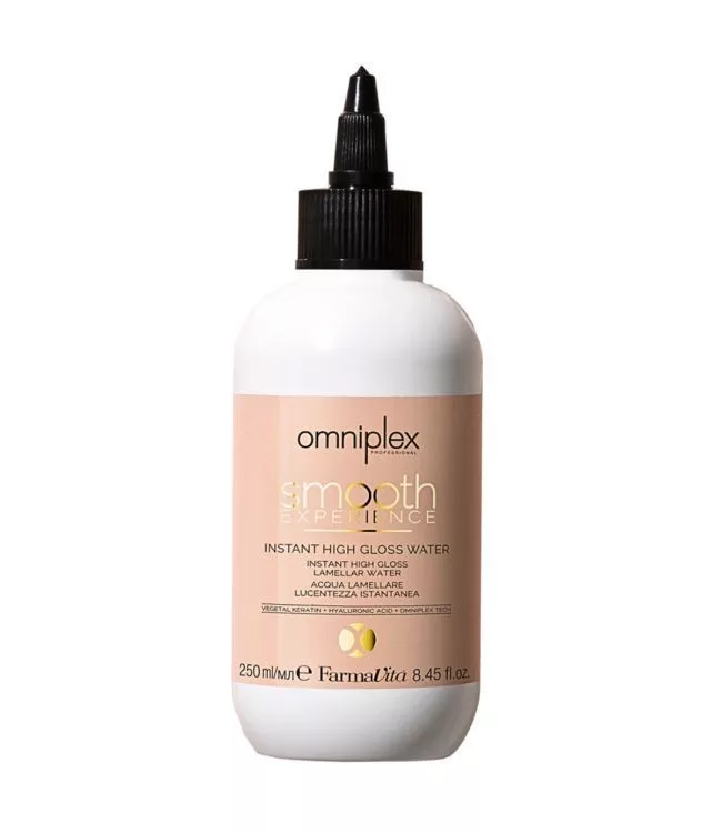 A Farmavita Omniplex Smooth Experience Instant High Gloss Water 250ml egy professzionális, kondicionáló fényes kezelés. Az Instant High Gloss Water pillanatok alatt szupersima, rendkívül fényes és könnyeddé alakítja a hajat. A formula növényi keratin komplexet, Omniplex technológiát és hialuronsavat tartalmaz, amelyek erősítik, védik, dúsítják és gyönyörűen simává és fényessé varázsolják a hajat. A hialuronsav vékony réteggel vonja be a hajat, így szuper sima, selymes és gyönyörűen üvegszerűen fényes lesz. Az Instant High Gloss Water a szalonban az Omniplex Smooth Experience szolgáltatások Filler High Gloss Spa és Glass Hair laminálásának elvégzésére szolgál. A formula 100%-ban vegán.