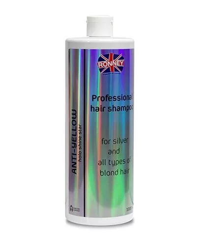 A Ronney HoLo Shine Star Anti-Yellow Shampon egy tisztító, tápláló és sárga tónust csökkentő sampon világos hajra - szőke, szőkített és ősz hajra.