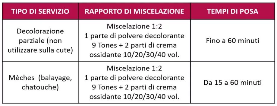 Hatóidő: A hatóidő 15 és 60 perc között változhat a következőktől függően: a haj alapszíne, a kívánt világosítási szint, a haj állapota, az alkalmazott technika típusa, a munkakörnyezet hőmérséklete, a használt fejlesztő mennyisége és mennyisége.