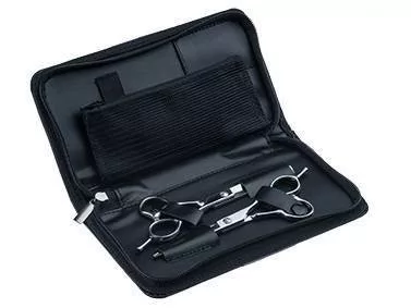 Tanuló Szett. A szett tartalma: 1darab vágó olló + 1 darab ritkító olló + 1 db törlőkendő + 1 db csavarállító + 1 db ollótartó zippzáras.